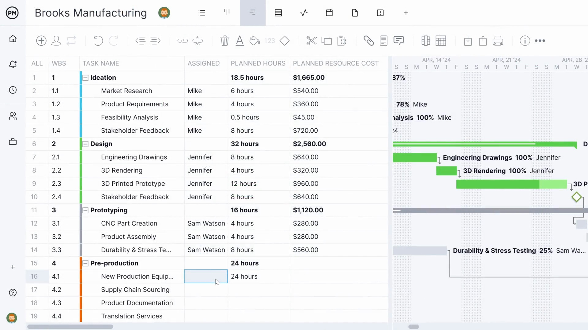 There are no columns for planned versus actual start and end dates, planned versus actual duration or planned versus actual costs. The roadmap doesn’t support cost tracking columns, resource allocation from the Gantt view, work breakdown structure (WBS) levels, four types of task dependencies or automated critical path analysis. It also lacks custom columns and a task assignee column. All of these capabilities are available in ProjectManager’s Gantt chart.