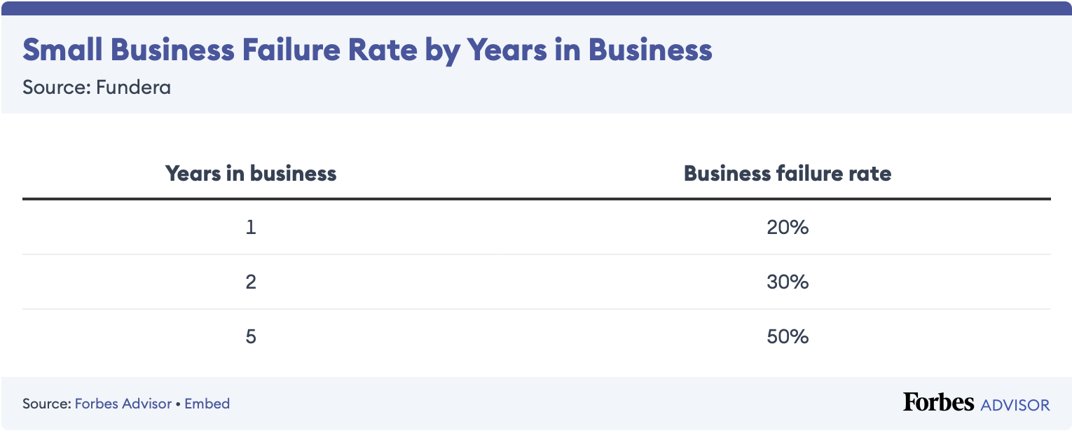 Did you know that one in five small businesses fail in the first year? According to Fundera, 20% of startups fail in the first year. About 30% end in their second year, while only half (50) last for about five years.